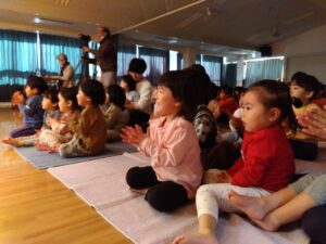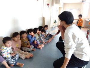 年少さんが楽しく歌い、仕草する姿を真剣に見る子ども達。